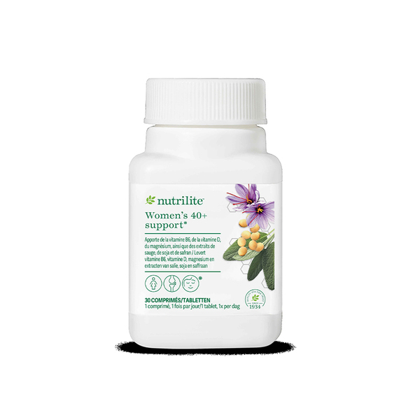 *Nutrilite™ Women's 40+ support contains vitamin B6, vitamin D and magnesium. Vitamin D and magnesium contribute to the maintenance of normal bones and teeth. Vitamin B6 and magnesium contribute to normal psychological function and the reduction of tiredness and fatigue. Vitamin B6 contributes to normal protein and glycogen metabolism. Enriched with extracts from sage2, soy and saffron2.